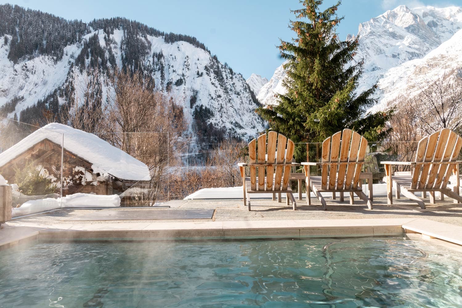 The spa, La Maison de l’Eau, integrates the mountain environment into recovery and relaxation. Its heated pool spans indoor and outdoor areas, offering direct views of Mont Blanc while you float. A sauna, steam room, and outdoor terrace provide additional spaces to unwind.