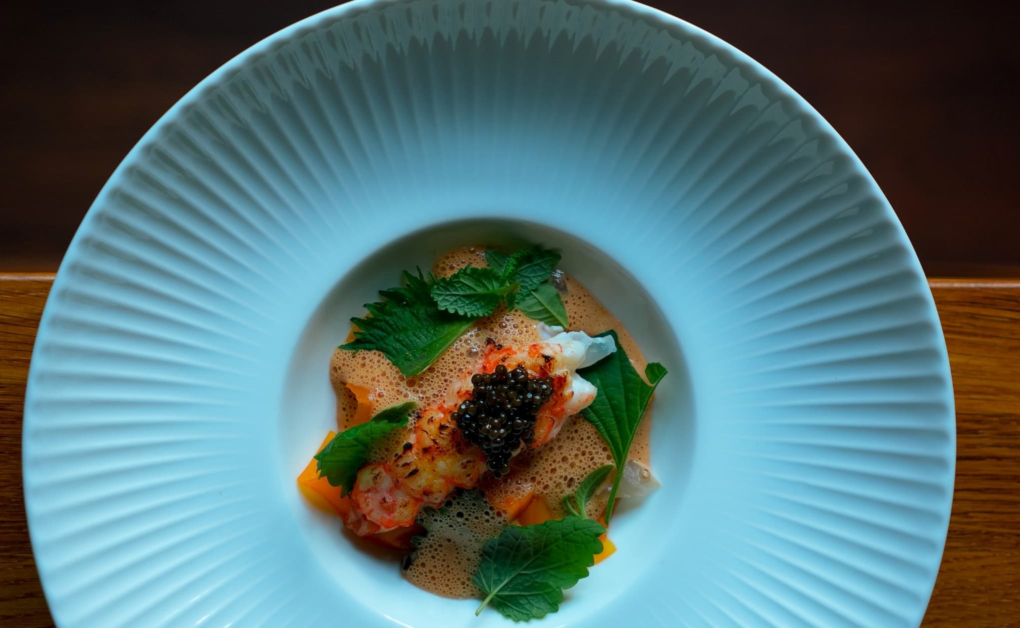 The opening courses establish the tone immediately. Le Gris Special oysters arrive with pickled rose mignonette and vanilla oil, balancing marine salinity with delicate sweetness. Raw scallop follows, paired with pickled horseradish and crisp daikon. Gougères filled with Comté and truffle provide a warm and savoury contrast. The Gambero Rosso prawn carpaccio introduces a more unusual pairing, combining the prawn’s sweetness with rhubarb and rooibos tea. Lemon sole closes this portion of the meal, served with kale, trout roe and champagne beurre blanc, a dish that demonstrates the kitchen’s command of both classical technique and contemporary restraint.