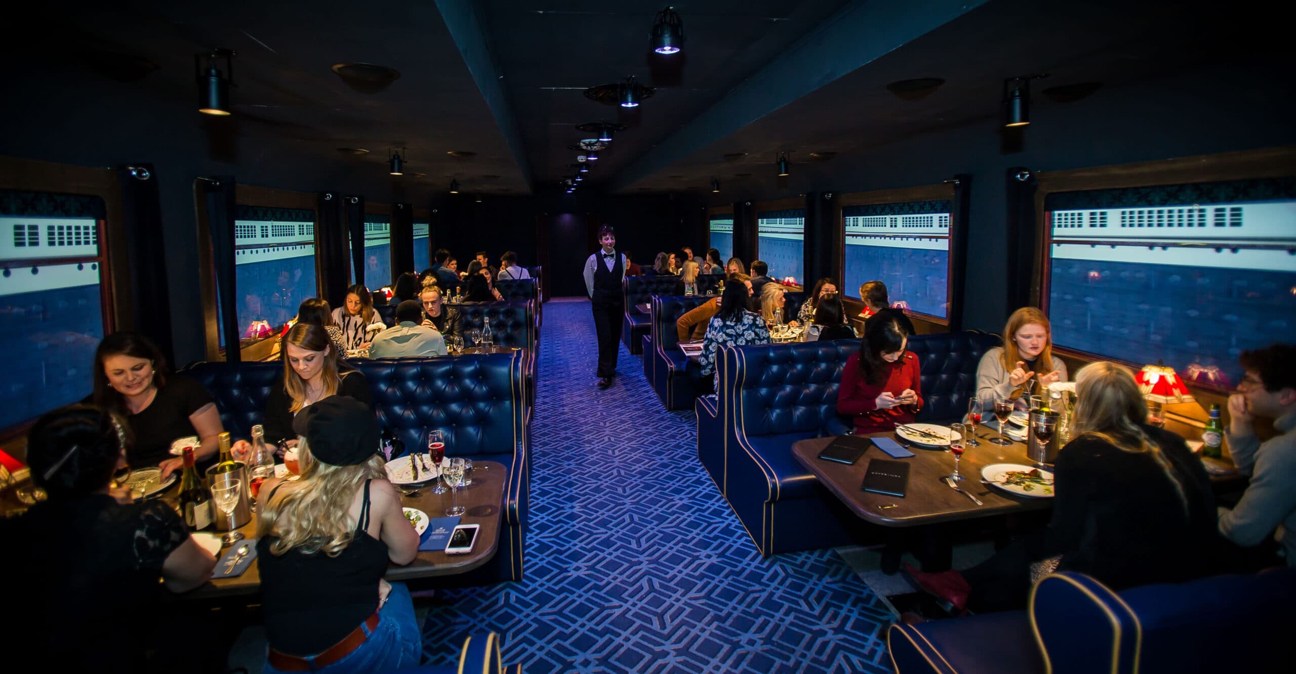 The transition from station to carriage is handled with a sense of timing that mirrors the structure of the show itself. Guests gather initially in a departure-style bar before being called to board, at which point the experience becomes more focused. Inside, the dining carriage is arranged with banquette seating along both sides and a central aisle that serves as the primary performance space.
