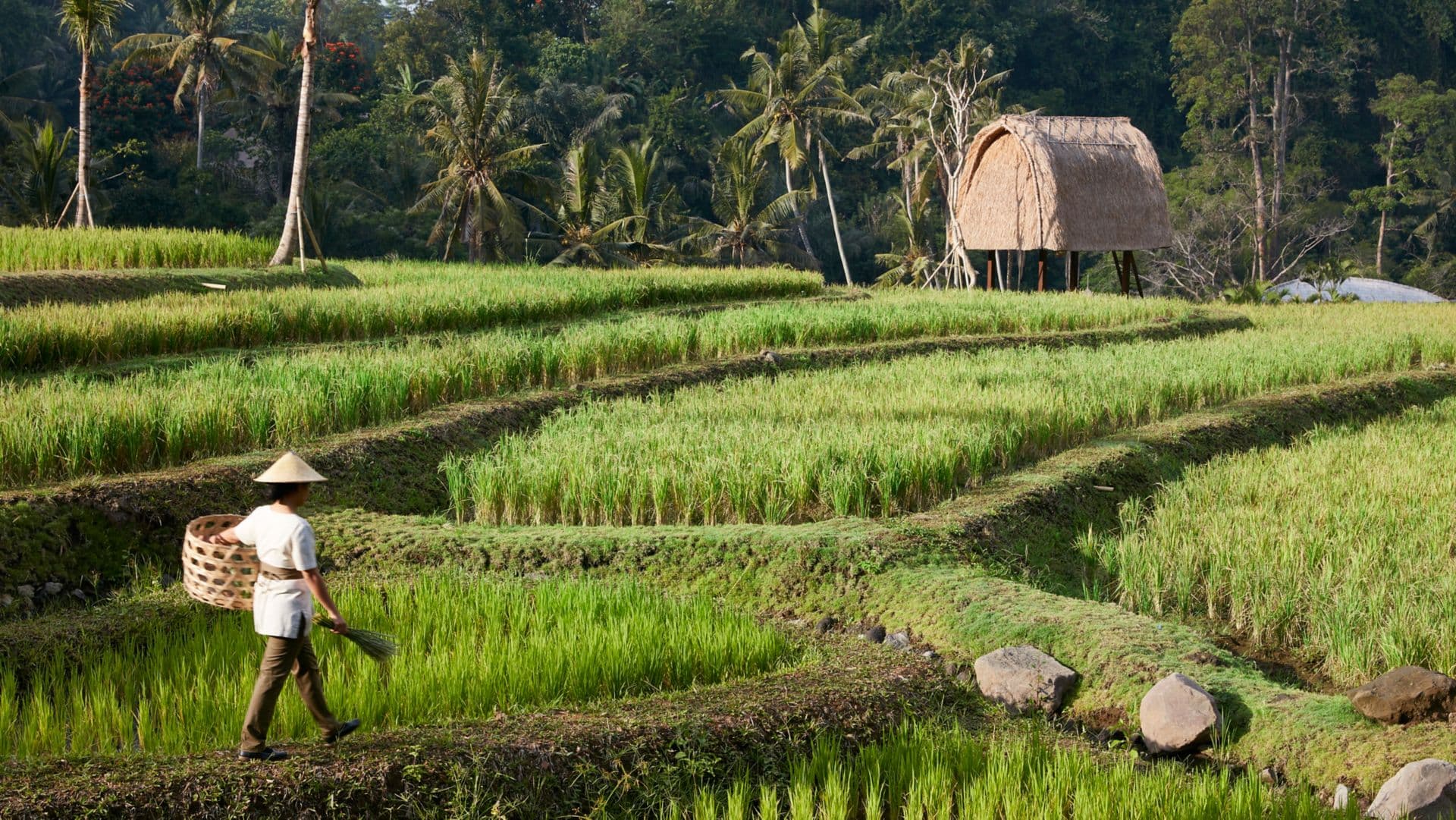 Walking through Mandapa feels remarkably similar to moving through a small Balinese settlement. The resort’s architects studied traditional village layouts and interpreted them through contemporary design. Buildings feature pitched roofs constructed from bamboo and other llocal materials and supported by carved wooden beams. Stone walls made from volcanic rock anchor structures into the hillside while open pavilions allow breezes to pass through. Rice paddies occupy the centre of the estate and remain actively cultivated. During my stay I watched farmers tending the fields in the early hours, reinforcing the impression that the landscape remains functional rather than decorative.