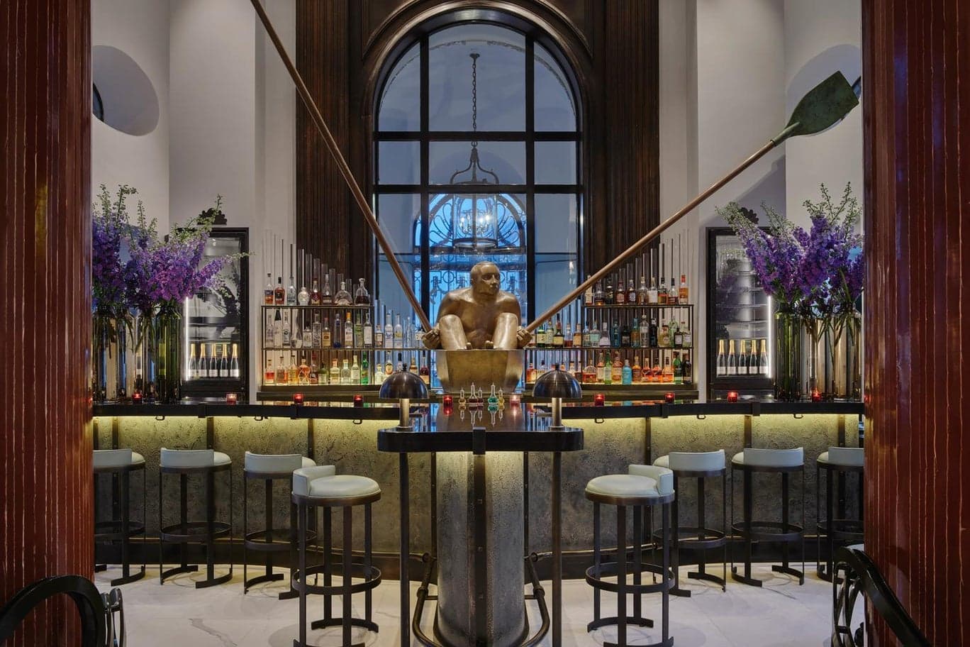 The interiors also house a remarkable contemporary art collection. More than 350 museum quality works appear throughout the building, often catching guests by surprise as they move between spaces. A playful papier mâché Beano dog by Justine Smith greets arrivals near the entrance, while the carved stone Head of Dionysus by Emily Young appears along the route to the elevators. The most striking piece remains André Wallace’s ten foot bronze Boatman with Oars, which anchors the Lobby Bar with unmistakable presence.