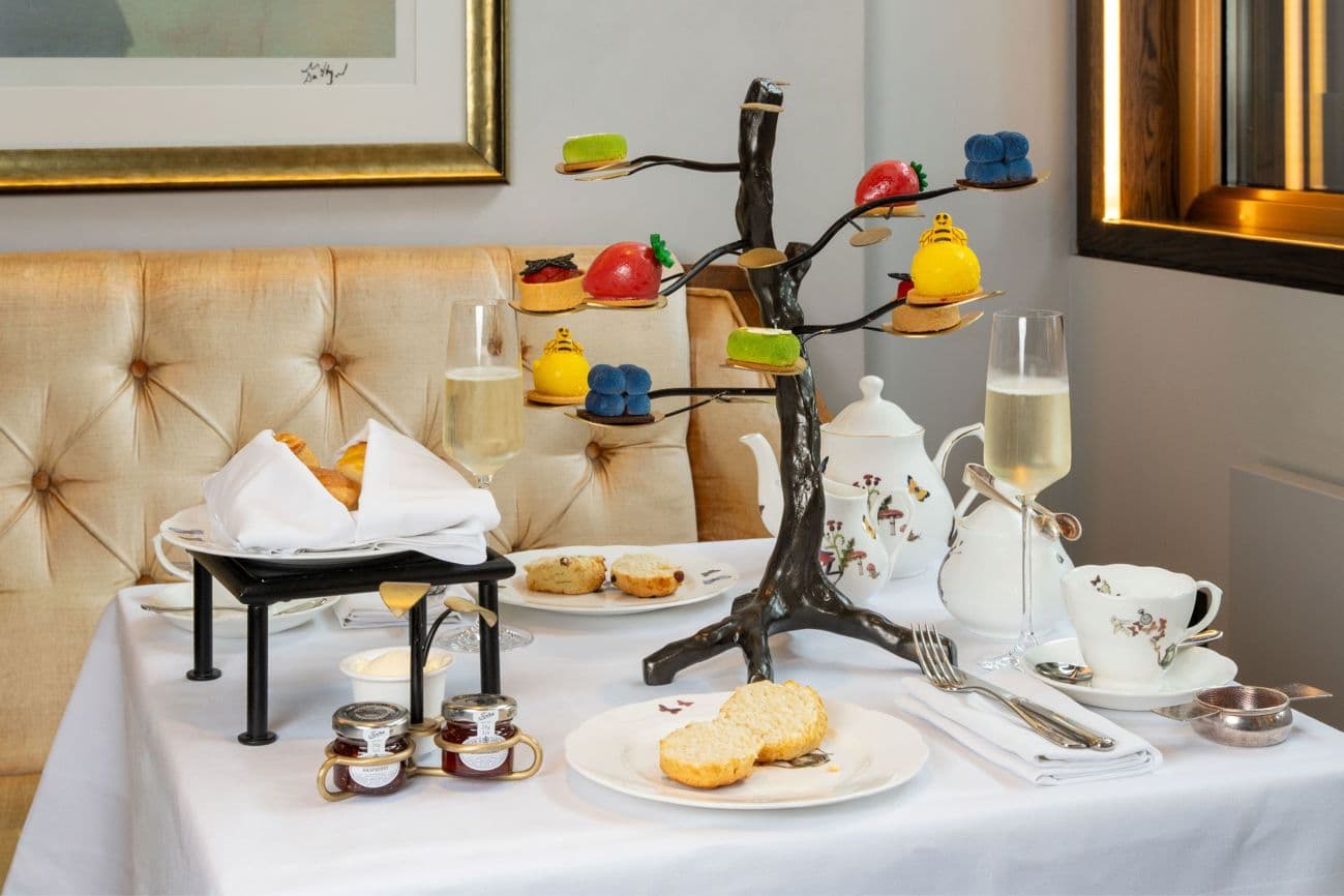 Afternoon tea is a carefully constructed experience, beginning with a bespoke tea blending ritual developed in collaboration with Alex Probyn. Guests are guided through a wide palette of ingredients, from Assam black tea to spices and botanicals, creating blends that feel considered and personal rather than predetermined. The savoury selection reflects the same attention, from Maldon-cured salmon with horseradish crème fraîche on Guinness bread to coronation chicken with a fruit-led profile and a sharper, more mature cheddar variation, each calibrated for contrast rather than repetition.