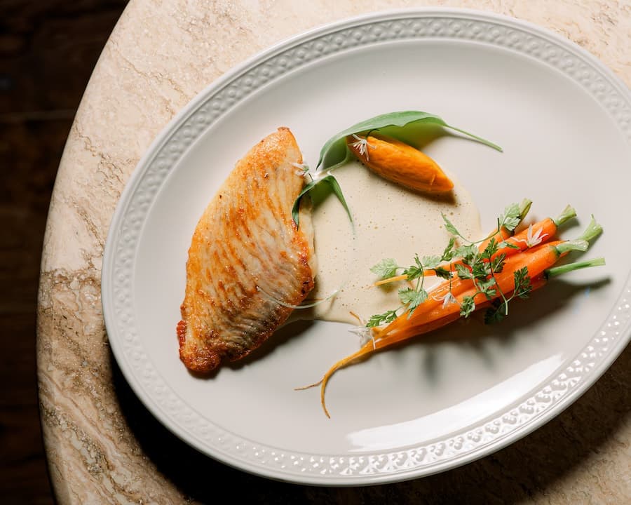 The opening courses establish the tone immediately. Le Gris Special oysters arrive with pickled rose mignonette and vanilla oil, balancing marine salinity with delicate sweetness. Raw scallop follows, paired with pickled horseradish and crisp daikon. Gougères filled with Comté and truffle provide a warm and savoury contrast. The Gambero Rosso prawn carpaccio introduces a more unusual pairing, combining the prawn’s sweetness with rhubarb and rooibos tea. Lemon sole closes this portion of the meal, served with kale, trout roe and champagne beurre blanc, a dish that demonstrates the kitchen’s command of both classical technique and contemporary restraint.