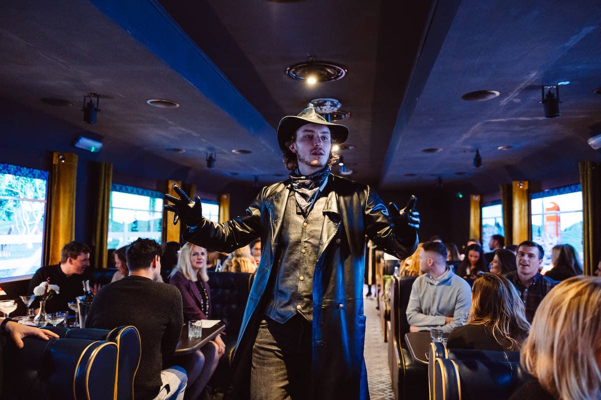 The transition from station to carriage is handled with a sense of timing that mirrors the structure of the show itself. Guests gather initially in a departure-style bar before being called to board, at which point the experience becomes more focused. Inside, the dining carriage is arranged with banquette seating along both sides and a central aisle that serves as the primary performance space.