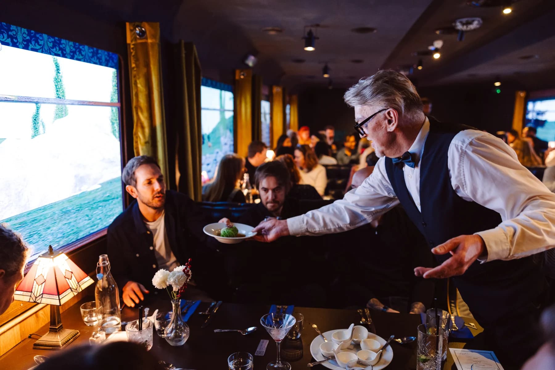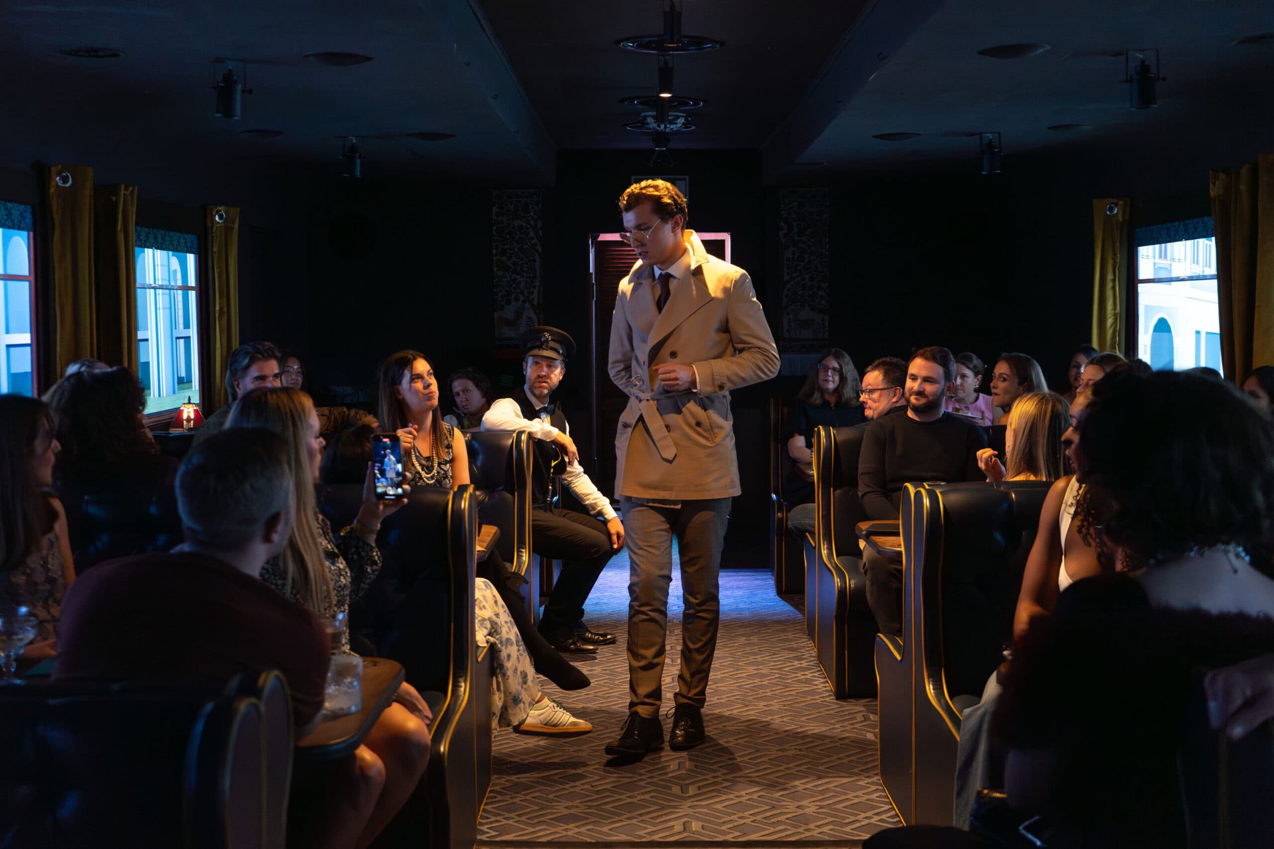 What stands out is the constant movement. The actors do not remain fixed in place but circulate through the room, shifting between scenes and direct engagement with the audience. Conversations unfold at close range, clues are delivered in passing, and moments of humour often land through unexpected interactions at individual tables. This fluidity keeps the experience from ever feeling static.