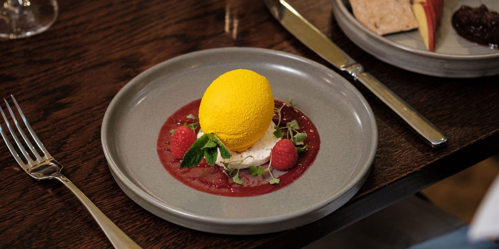 Watermelon tataki opens with a contrast of texture and temperature, its clean structure lifted by coconut emulsion and rhubarb ponzu, while roasted miso peanuts add a necessary savoury edge. The menu is carefully balanced, offering seafood, vegetarian choices, and meats such as the 30-day dry-aged Denham Vale rib-eye, where the kitchen steps back to let the ageing process define flavour and texture, complemented by classic sauces and sides. Among the seafood options, the stone bass stands out, paired with crushed new potatoes and native coastal vegetables, its potted shrimp sauce bringing a concentrated, saline intensity that anchors the dish.